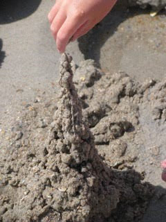 Gabrielle draws an ‘a’ in the sand with a broken shell.