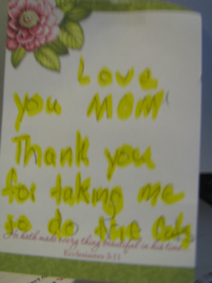 It reads: Love you Mom.  Thank you for taking me to do the cats.