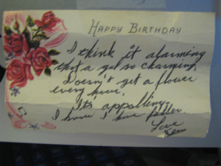 Here is a love note a beau sent to my maternal grandmother over 50 years ago.  I found it in a box of old postcards.  It struck me so, when I first read it, that I kept it and have it taped on the bottom of my computer screen.
