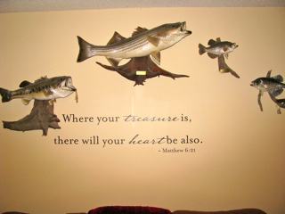 My husband’s ‘trophy’ fish are proudly displayed on our den’s walls. And although, to be honest, I haven’t always loved appreciated his contribution of decor into this room, this piece doesgo nicely with the fish theme…..