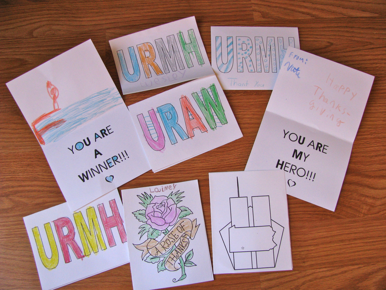 I asked a gentlemen a few months ago for some of his cards to send to soldiers.  He actually designed these cards driving cross country raising money for our troops.  If you look closely at the bottom right card, he designed it to include the Twin Towers, The Pentagon, and the state of Pennsylvania where the plane went down during the terrorist attacks of 9/11.  The kids colored them and included them in the care package.  There is a card for Chris and cards for him to share with other soldiers.