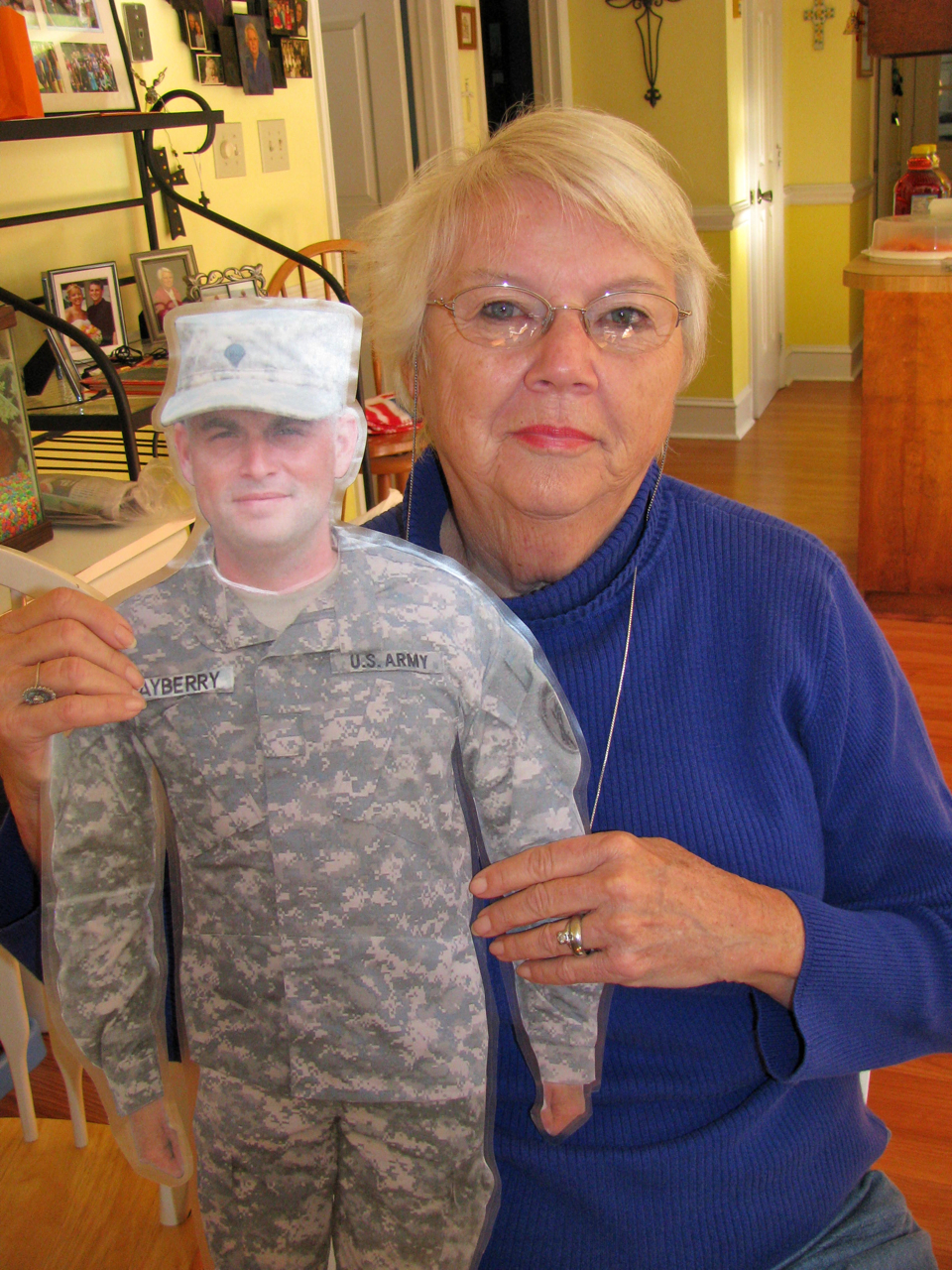 Neecie made an ‘almost’ life size photo of Chris to give to his family so he could be ‘here’ with us.  I think this is such a great idea!  It is a way to include him in their daily lives and send pictures so he can see.  Just blow up picture and use contact paper to cover and protect. The idea comes from Flat Stanley.