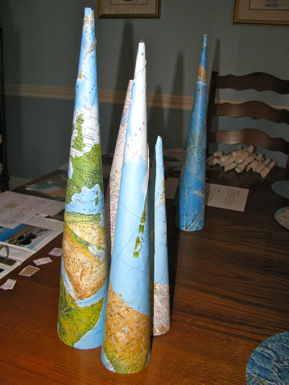 (just roll, tape, and even out base) made awesome table decorations.  We used mini flags for napkin holders and placemats.  AAA membership is a great resource for free maps and planning guides to use for decorations. I also scored a couple atlases from yard sales. Your imagination is the limit.