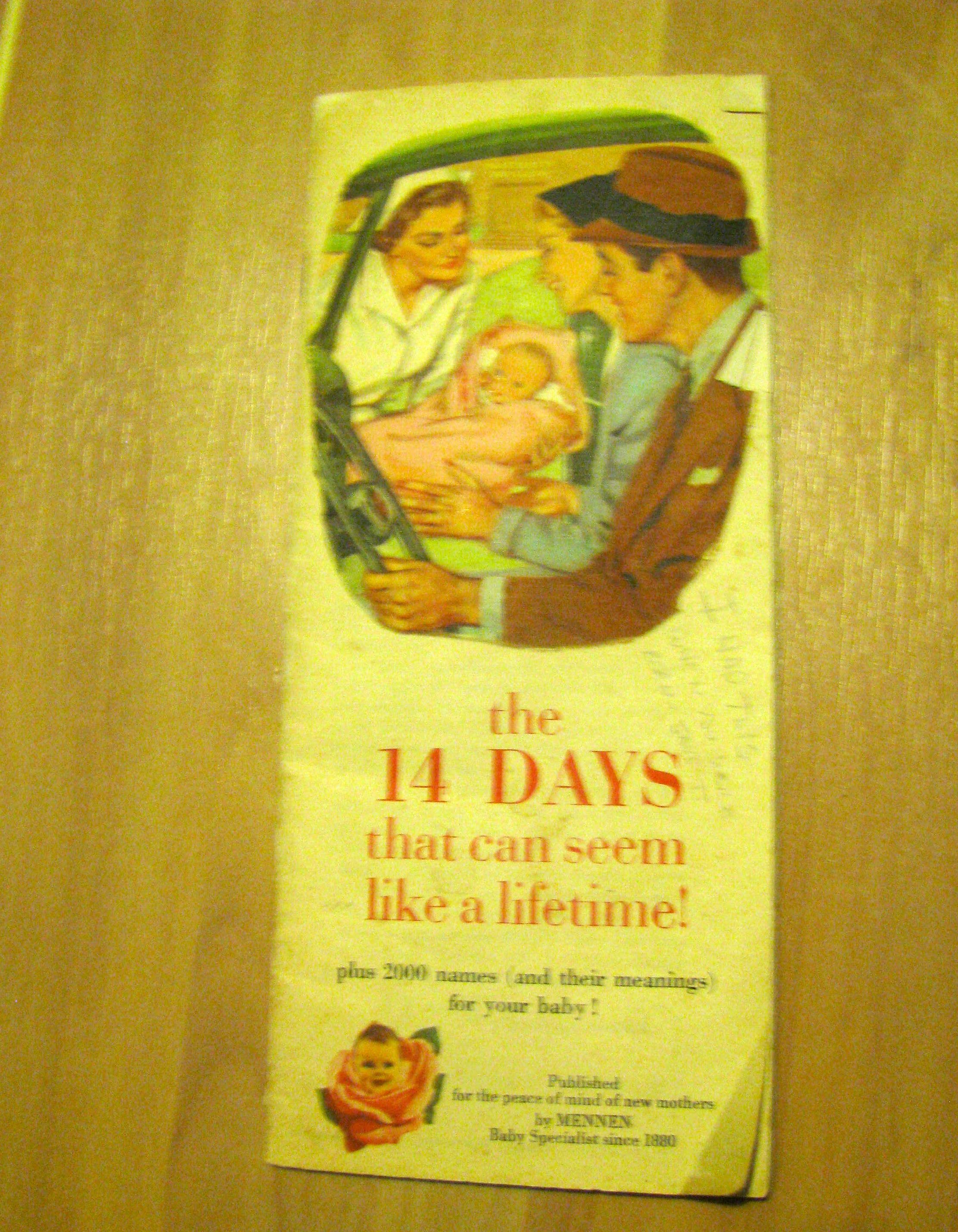 Looking in my hope chest as a young mom, I came across a brochure my mom had given me.  It was a baby care brochure that came from the Miami hospital where she had me in 1968.  It was all they had given her.  It was pretty silly, actually.  A small 31 page brochure of how to take care of a baby for 2 weeks.  The information on baby care consists of only 13 pages… the rest is baby names.  They advise hiring a baby nurse.  Seriously?  If only.